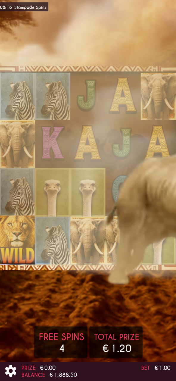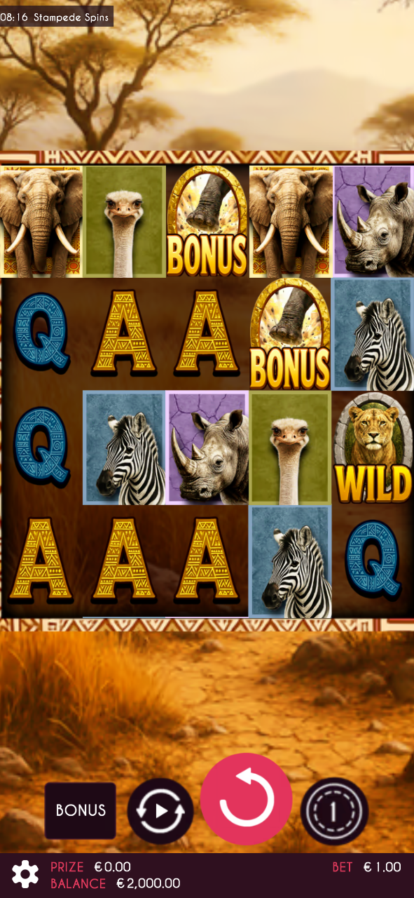 A savana ganha vida em Stampede Spins! Acompanhe os animais selvagens enquanto uma poderosa estampida atravessa os rolos, gerando Stampede Wilds e ativando uma empolgante rodada de Respin. Na fase de rodadas grátis, a estampida fica ainda mais intensa, transformando os Wilds em Sticky Wilds e aumentando as chances de grandes prêmios. Sinta a força da natureza a cada giro!