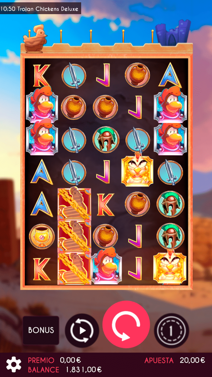 ¡La historia del caballo de Troya nunca fue tan divertida como en Trojan Chickens Deluxe! En este mundo lleno de humor y plumas, las vasijas explosivas pueden otorgar premios instantáneos y hacer avanzar al legendario Pollo de Troya hacia la fase de tiradas gratis. ¡Cada explosión te acerca a la conquista de fabulosas recompensas!