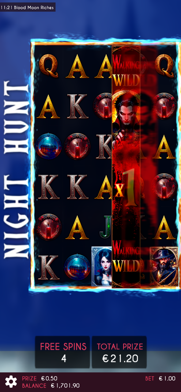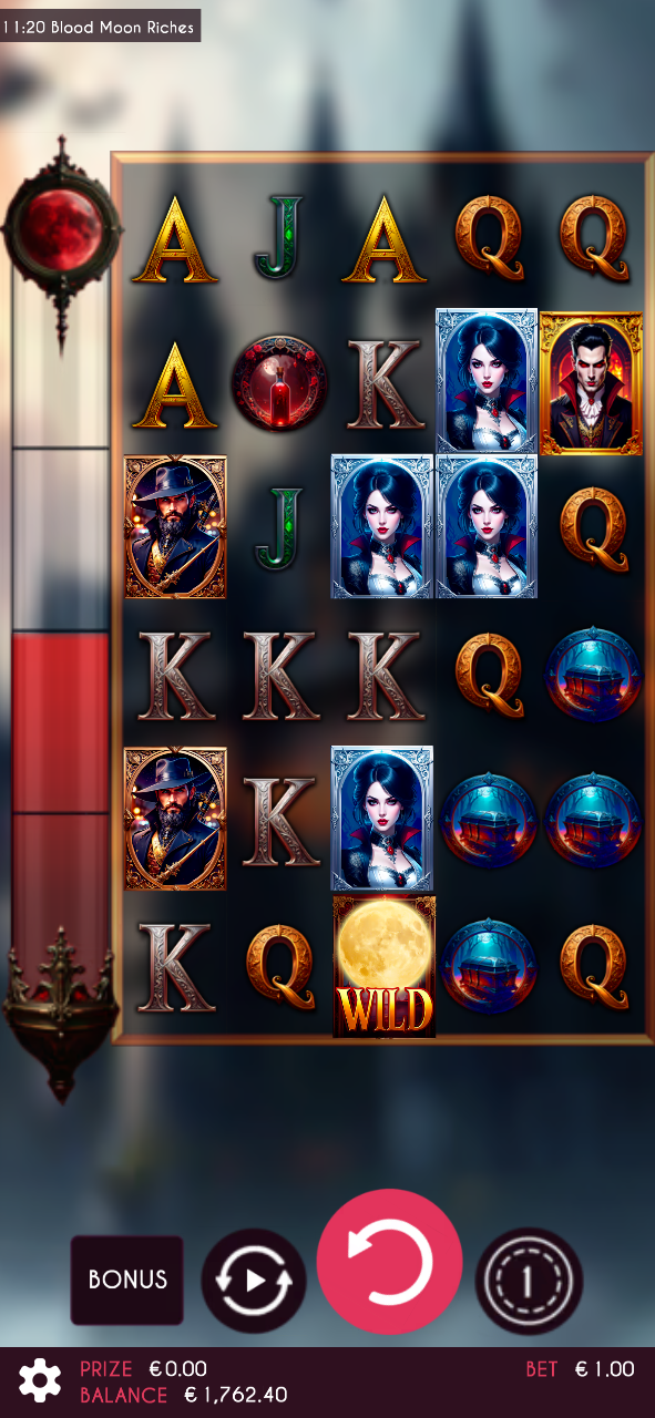 The crimson moon rises in Blood Moon Riches, a vampire-themed slot starring Dracula, his bride, and the fearless hunter. Collect orbs to advance the Blood Moon progress and unlock a special spin with thrilling rewards. Enter the Free Spins round with Walking Wilds, where each orb boosts the multiplier. Eternal darkness and endless riches await under the blood moon!